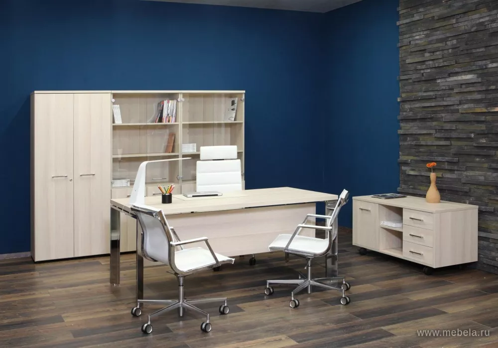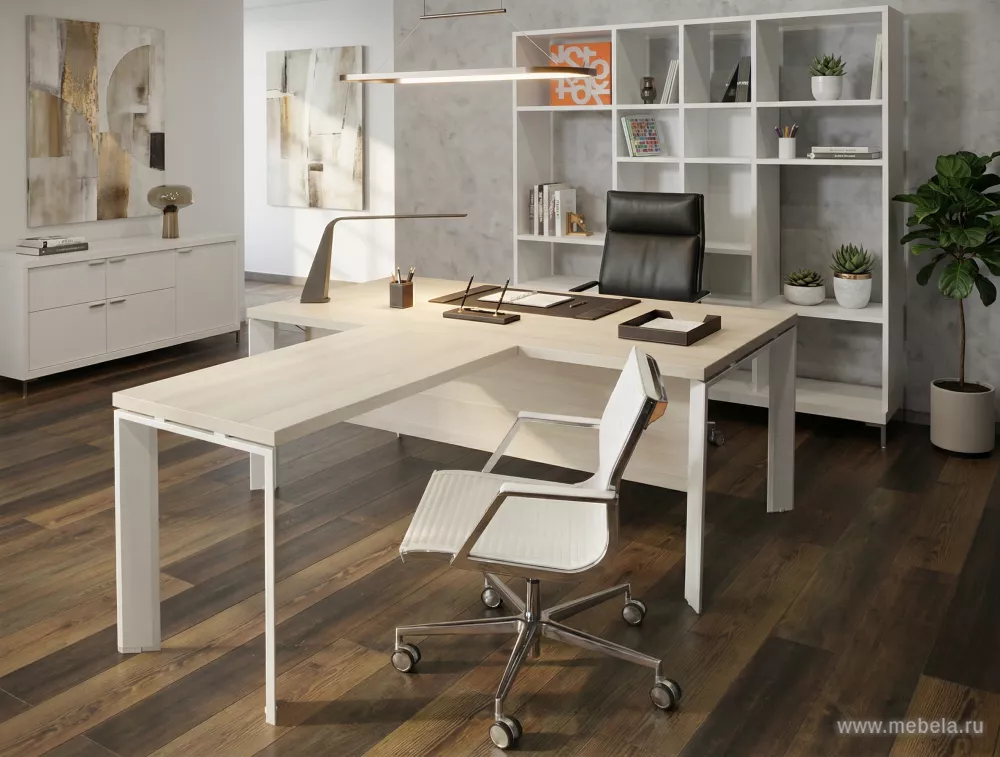 Когда требуется создать светлый и современный дизайн кабинета руководителя, то коллекция Фермо М + подходит для этого идеально. Легкость здесь прослеживается в каждой линии столов, а также в цвете их панелей выбеленного дуба, который легко моется благодаря ламинированному покрытию.