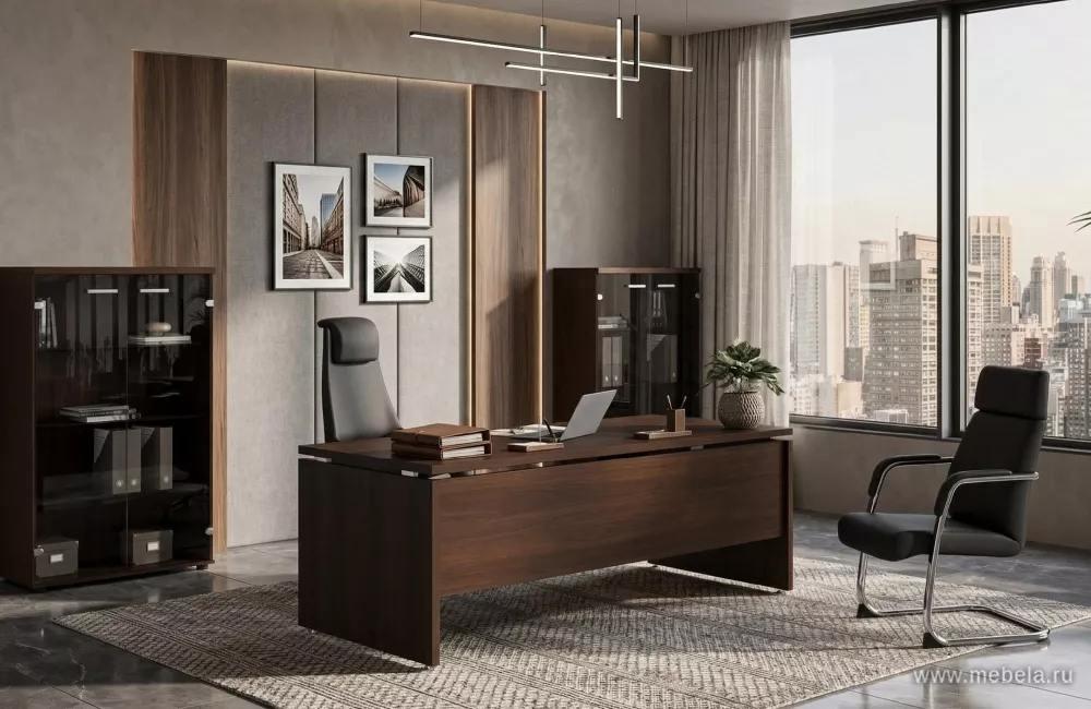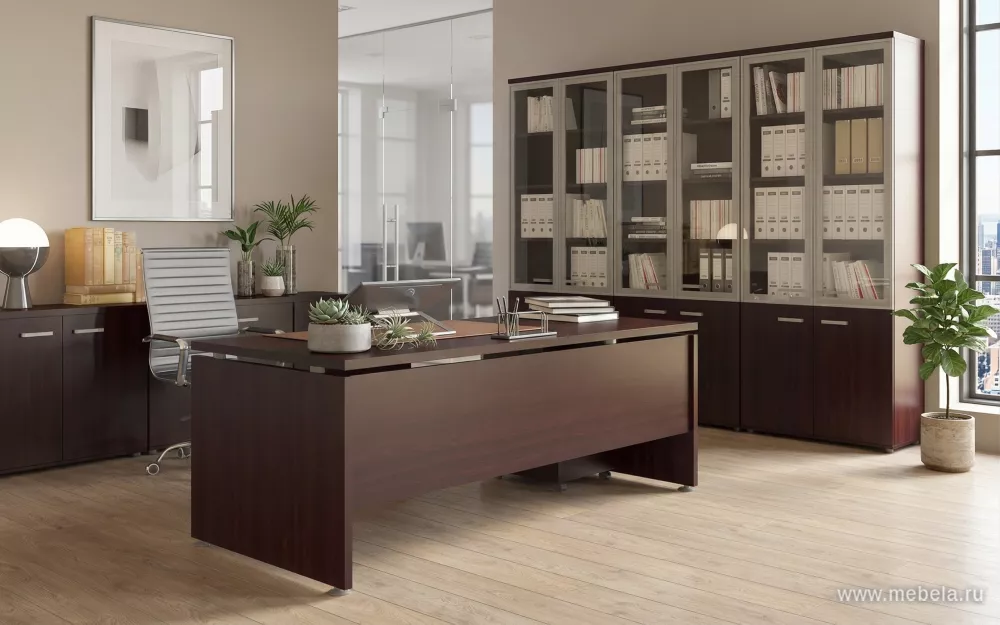 В мебели для кабинетов Grand удалось совместить классический официальный стиль с современными решениями. Прямоугольные массивные столешницы, имитирующие натуральное дерево, дополнены металлическими элементами фурнитуры, придающими комплекту мебели Grand оригинальности.