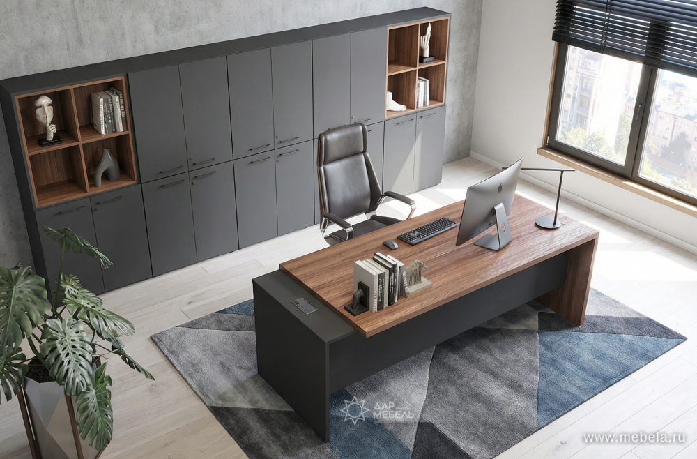 Кабинет для руководителя Кортез (Kortez) в цвете тёмный шимо - это не только рабочее пространство, но и место, где можно провести время с коллегами и партнерами. Он должен быть стильным, уютным и функциональным. В кабинете для руководителя должны быть удобные кресла, стол, шкафы для документов и другие необходимые предметы.