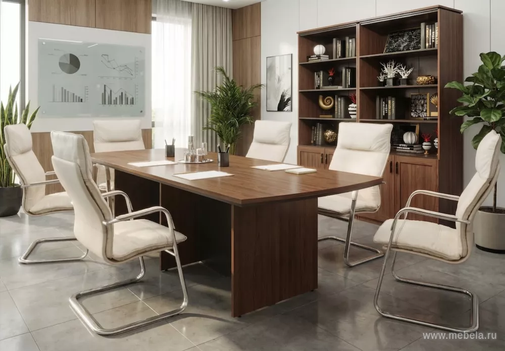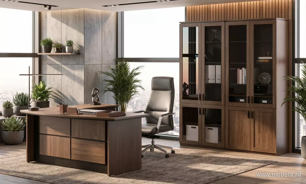 Оригинальный двухцветный комплект мебели для кабинета руководителя высшего уровня или владельца компании. Сочетание двух оттенков: Ред Фокс и венге, декорирование деревянными прямоугольными панелями, ровные линии и изящные ручки создают атмосферу успеха, финансового благополучия и стабильности.