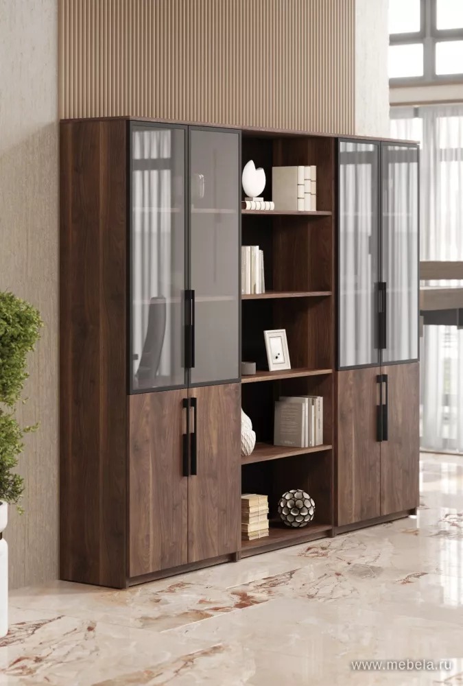 Кабинет руководителя «Тоскана» - стильная офисная мебель в цвете американский орех. Столешницы 38 мм, прочные ЛДСП панели, стеклянные двери в алюминиевой рамке, доводчики и качественная фурнитура. Идеальное решение для современного кабинета.