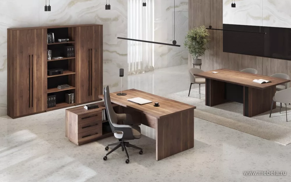 Кабинет руководителя «Тоскана» — это сочетание статуса, надежности и современного дизайна. Мебель выполнена в благородном цвете американский орех, который подчеркивает деловой стиль интерьера. Столешницы и боковины столов толщиной 38 мм обеспечивают прочность и солидный внешний вид, а усиле...