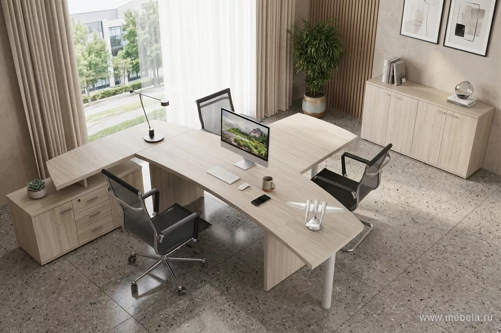 Кабинет руководителя Винг (Wing) светлый дуб — стильная и долговечная мебель для офиса. Изготовлена из ЛДСП с противоударной ПВХ-кромкой, оснащена качественной фурнитурой Boyard. Прочные столы и шкафы с алюминиевыми рамками и металлическими опорами.