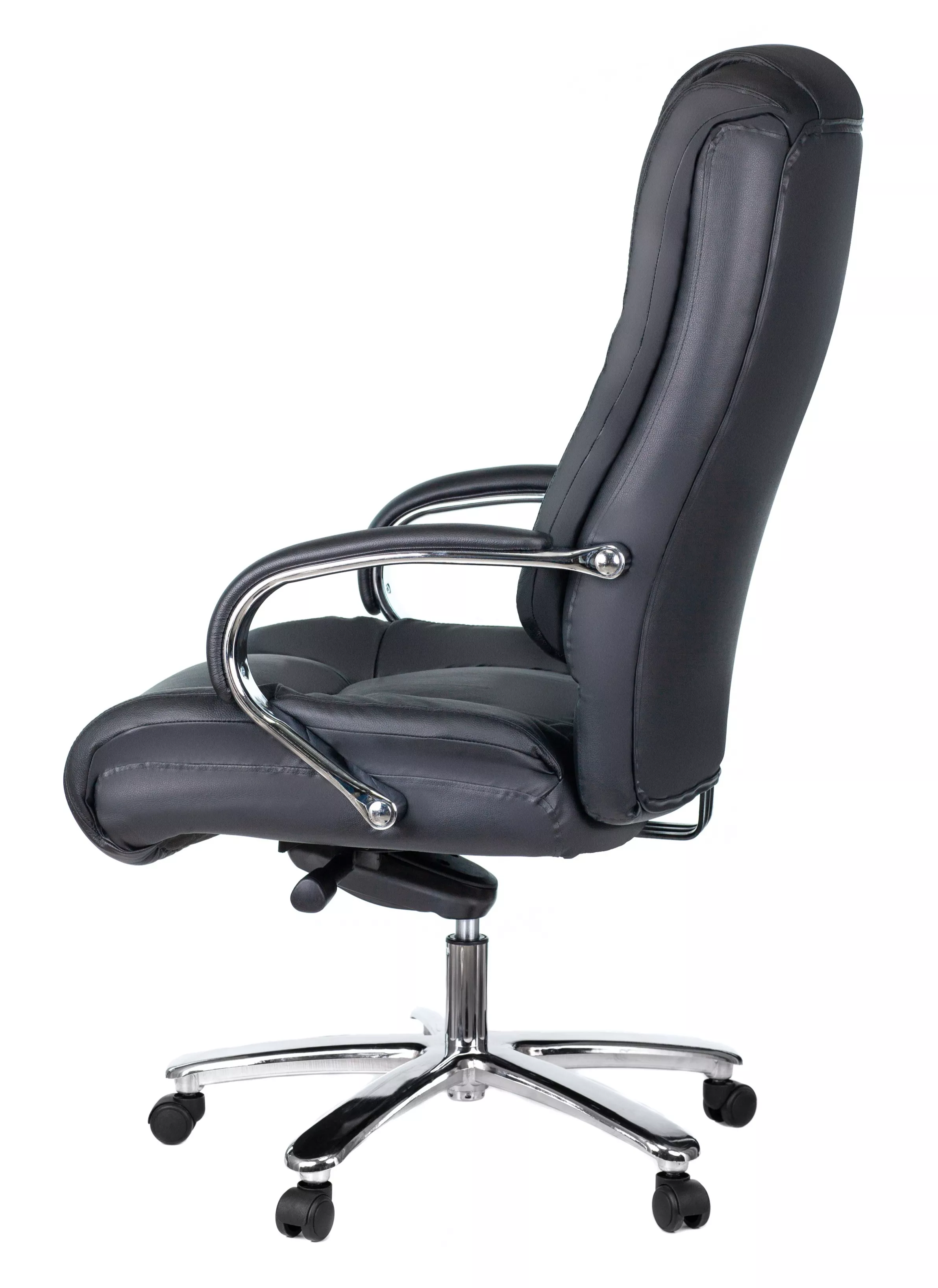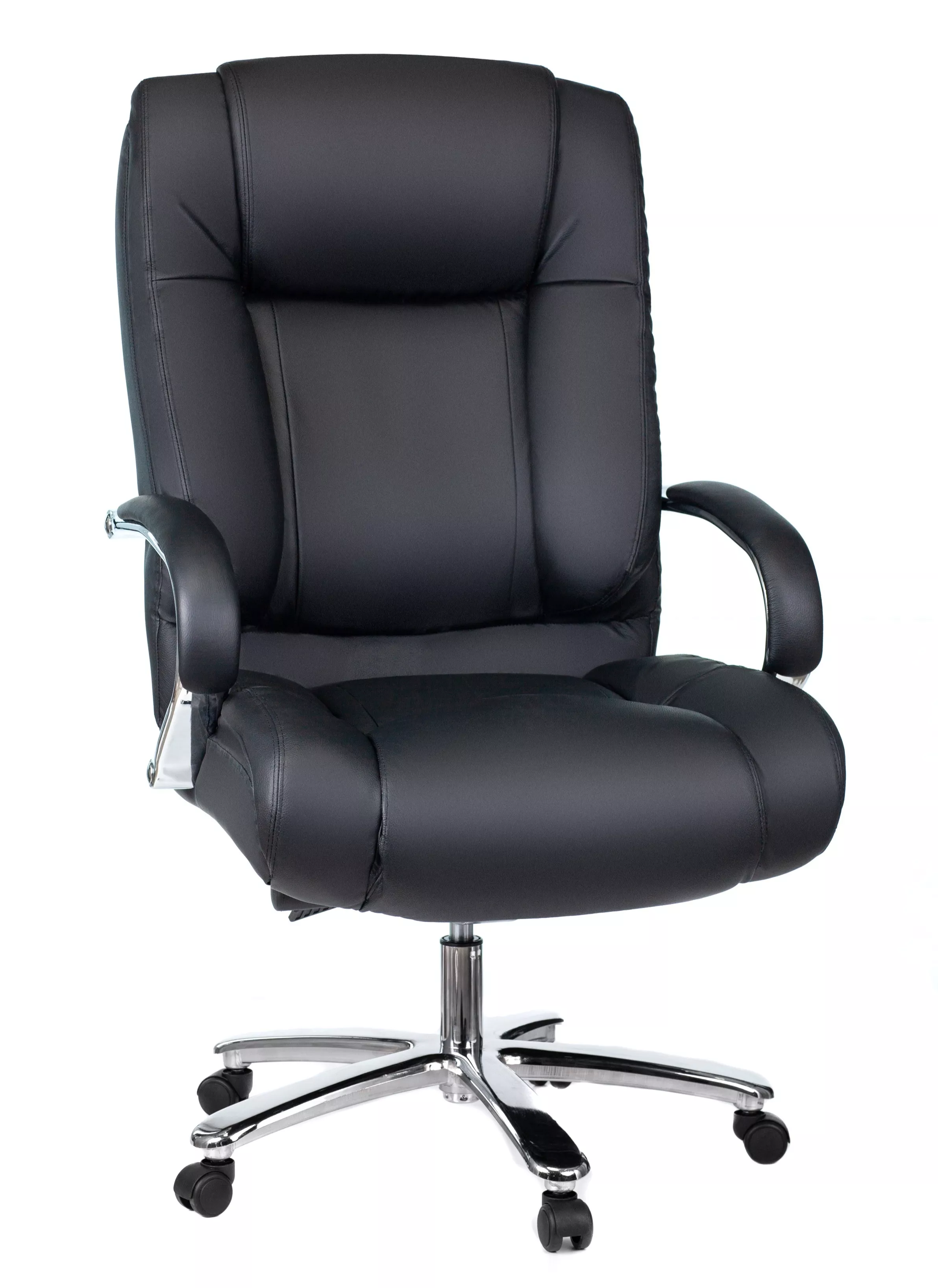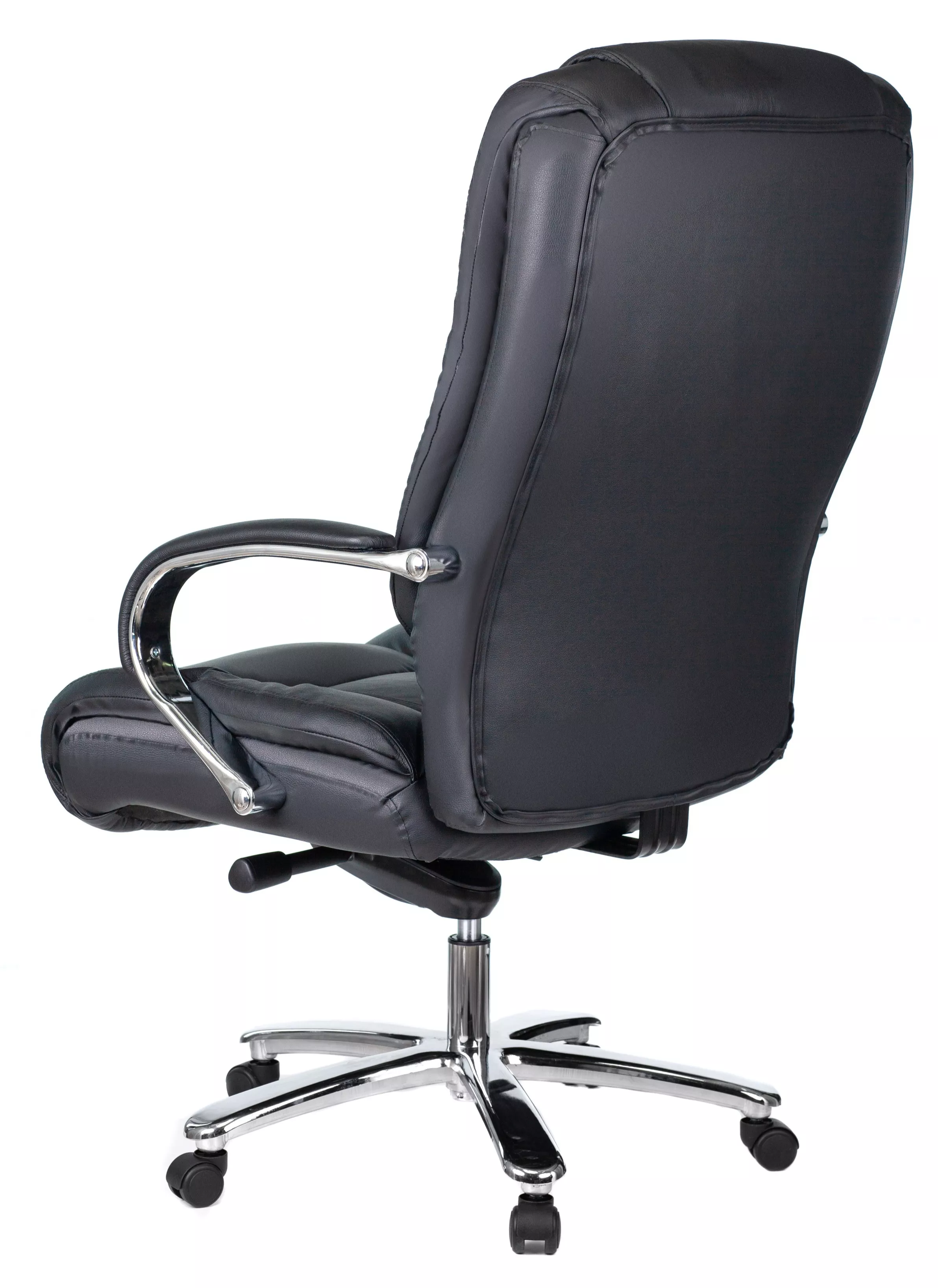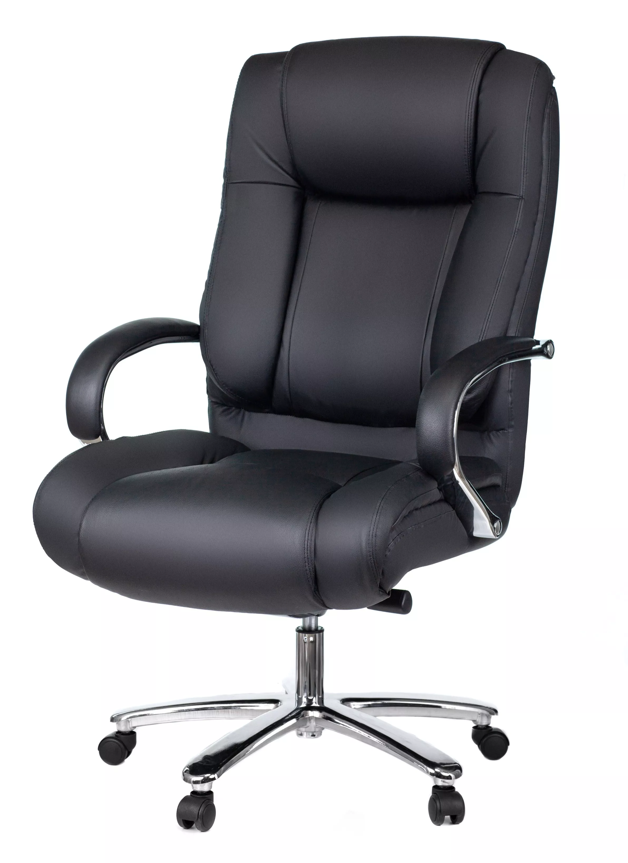 Кресло изготовлено из высококачественной экокожи черного цвета, которая отличается прочностью, гибкостью и долговечностью. Внешнее покрытие выглядит презентабельно и не поддается загрязнениям. Пластиковые колеса подходят для любого покрытия. Они не поцарапают ламинат, линолеум или паркет. Зафикси...