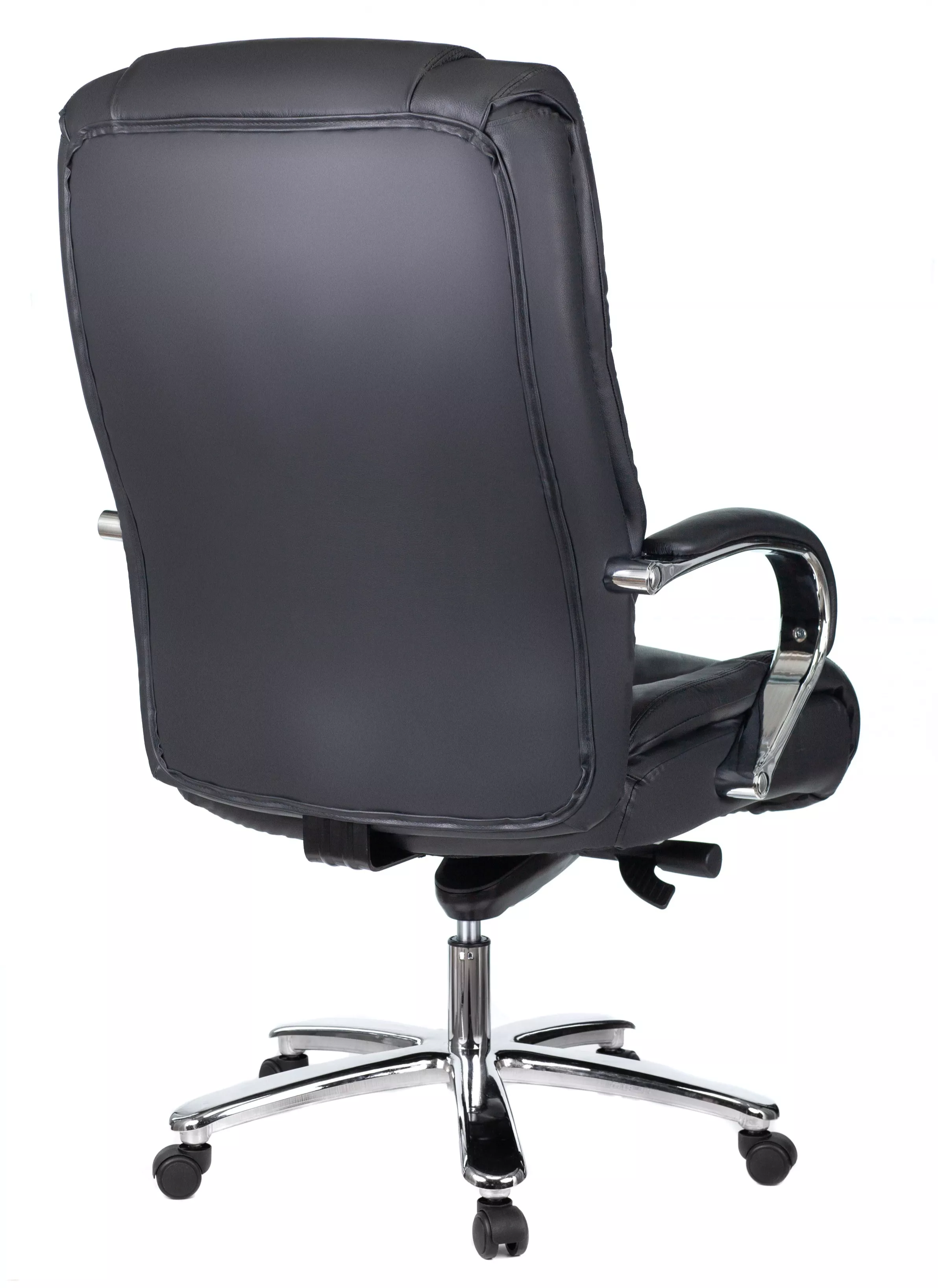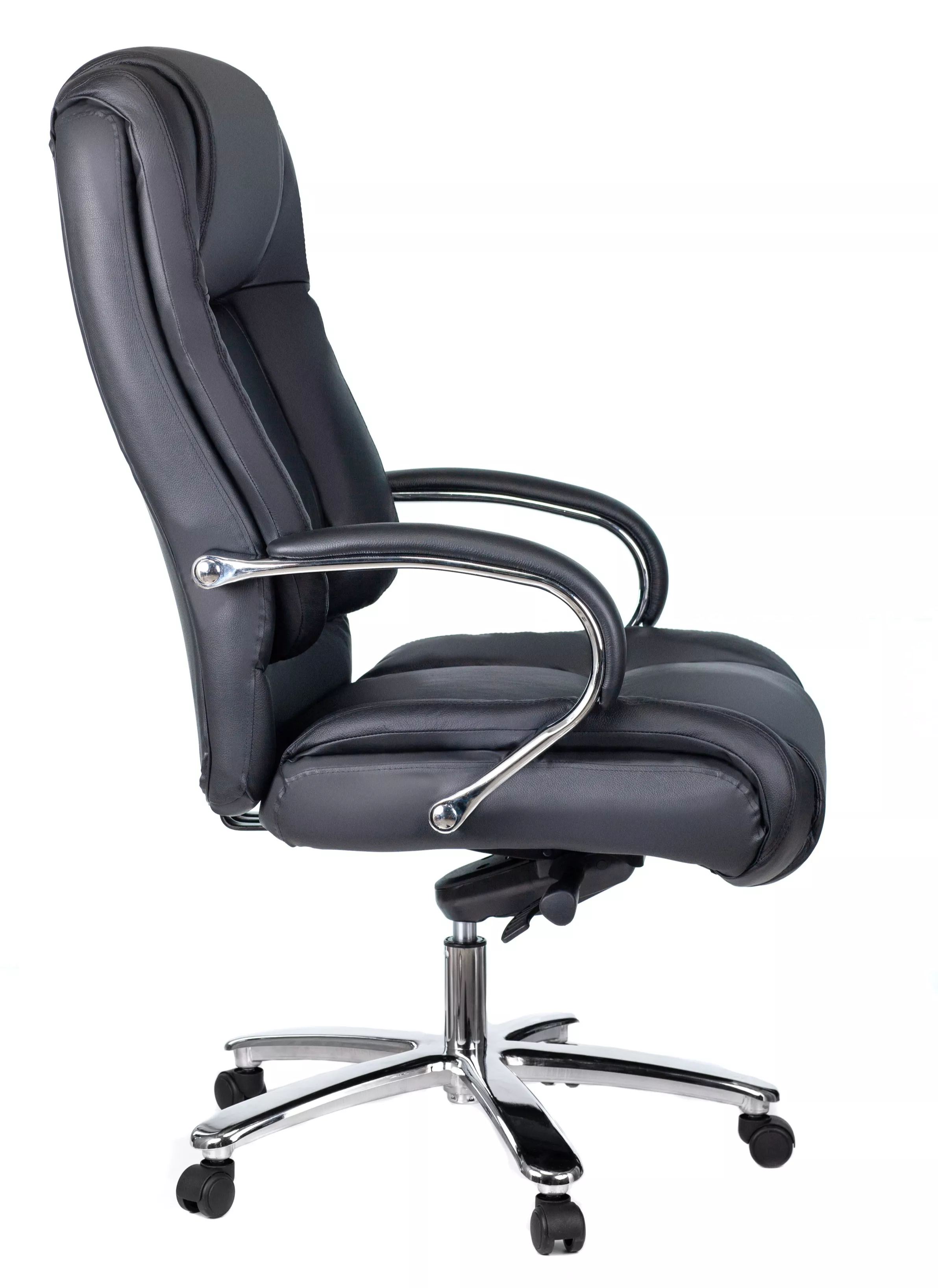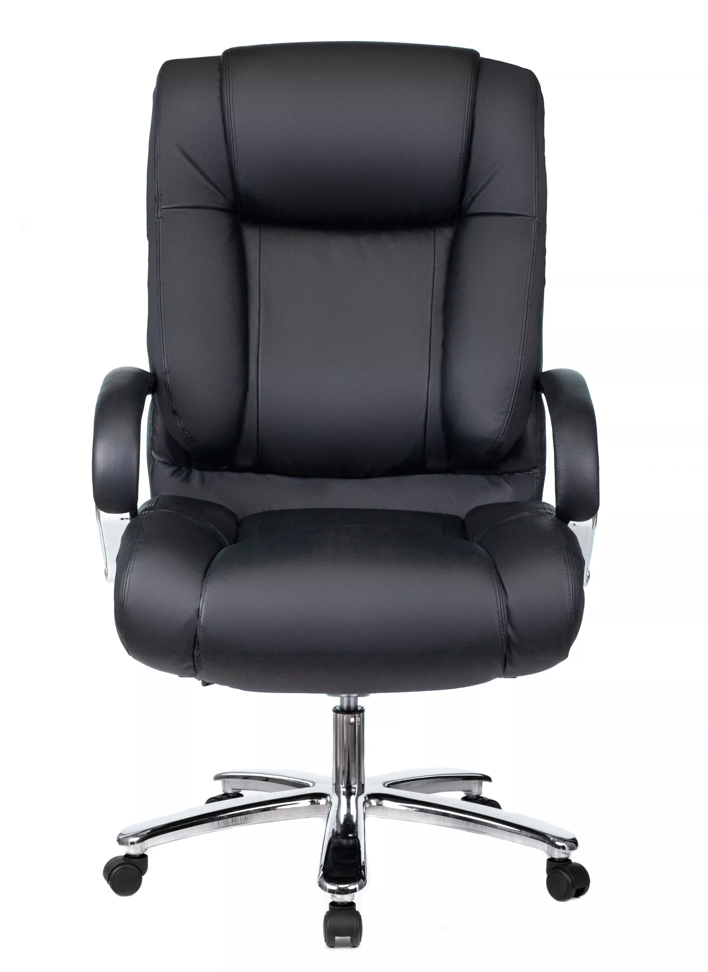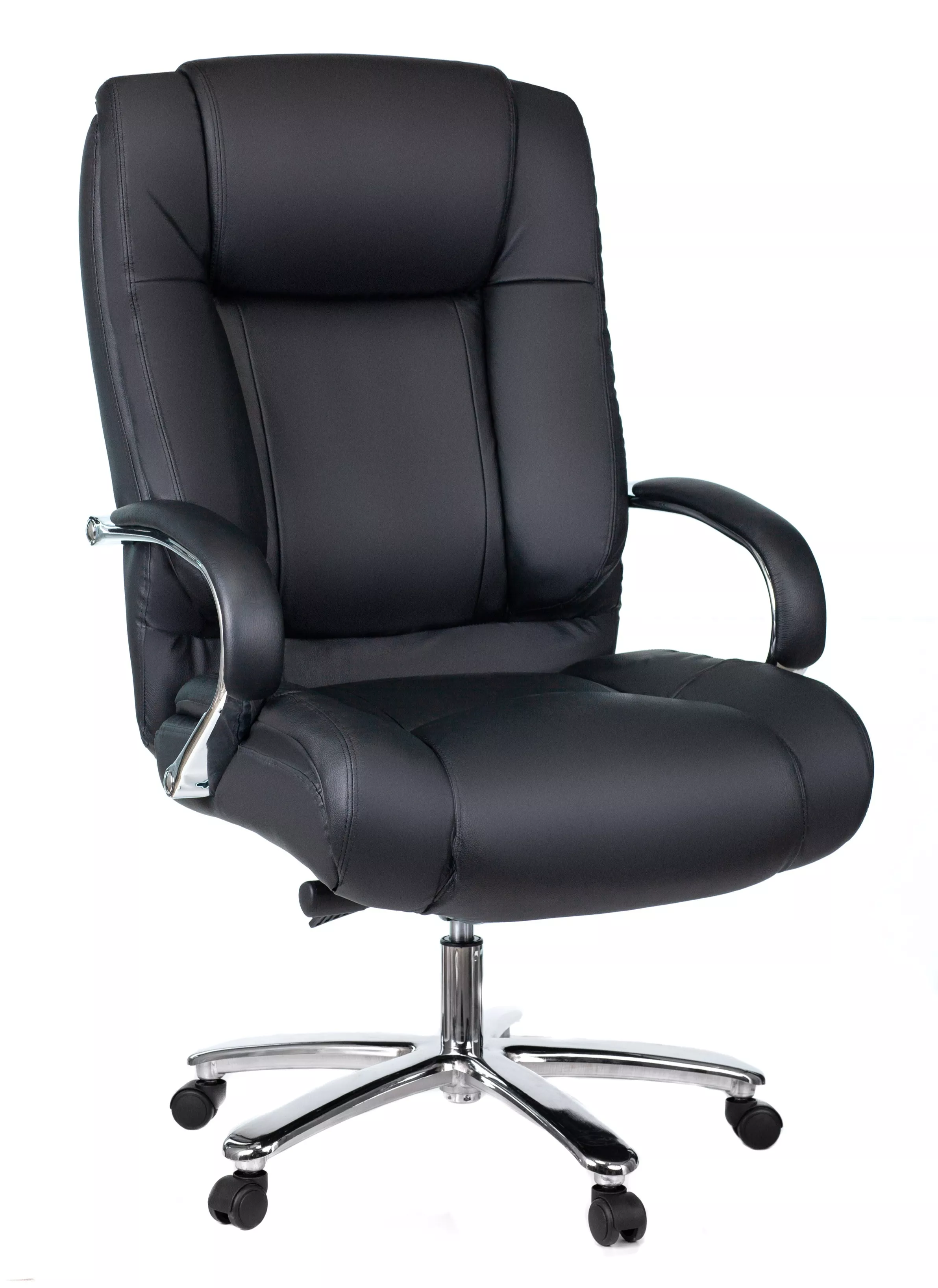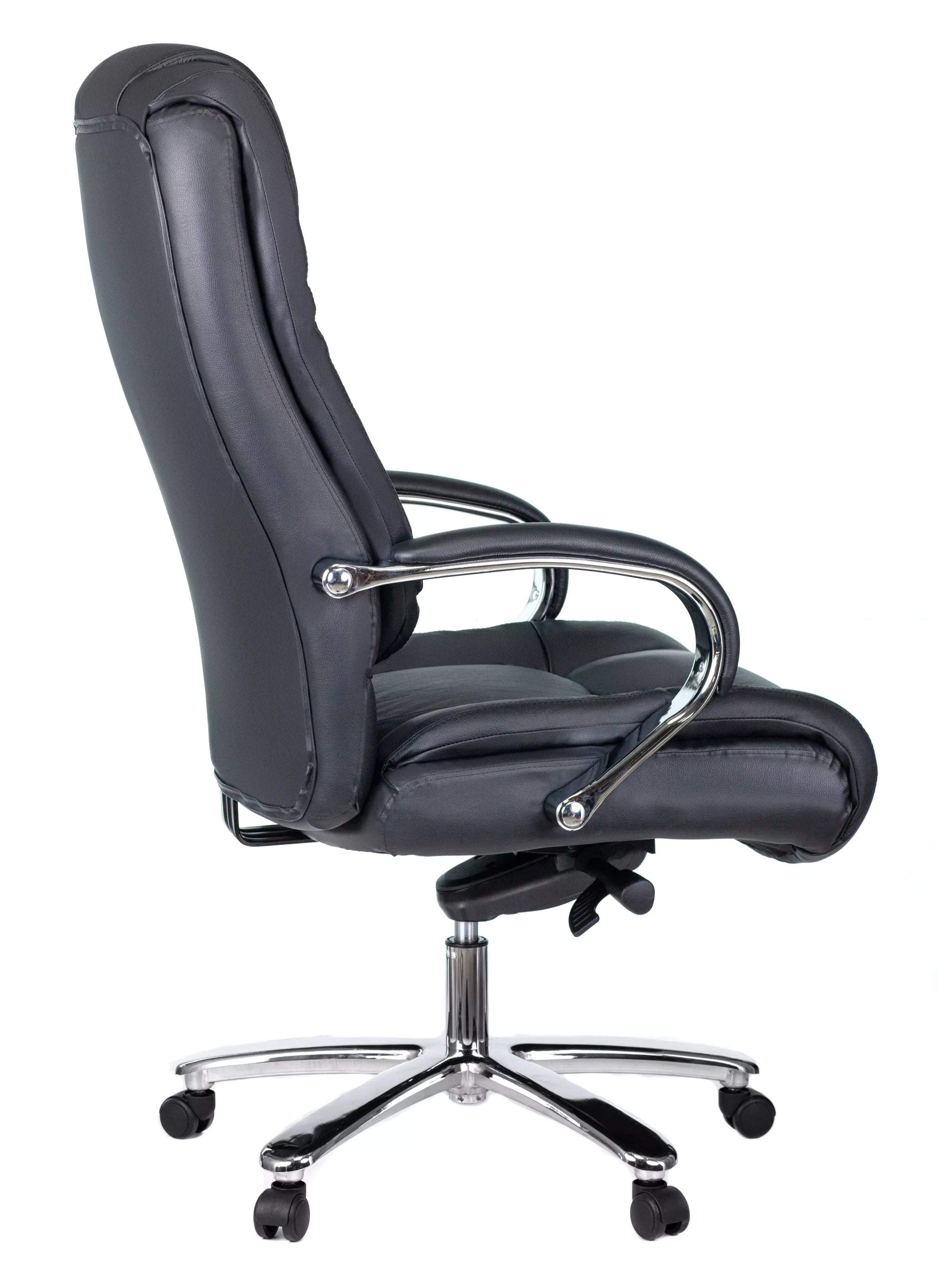 Кресло изготовлено из высококачественной экокожи черного цвета, которая отличается прочностью, гибкостью и долговечностью. Внешнее покрытие выглядит презентабельно и не поддается загрязнениям. Пластиковые колеса подходят для любого покрытия. Они не поцарапают ламинат, линолеум или паркет. Зафикси...