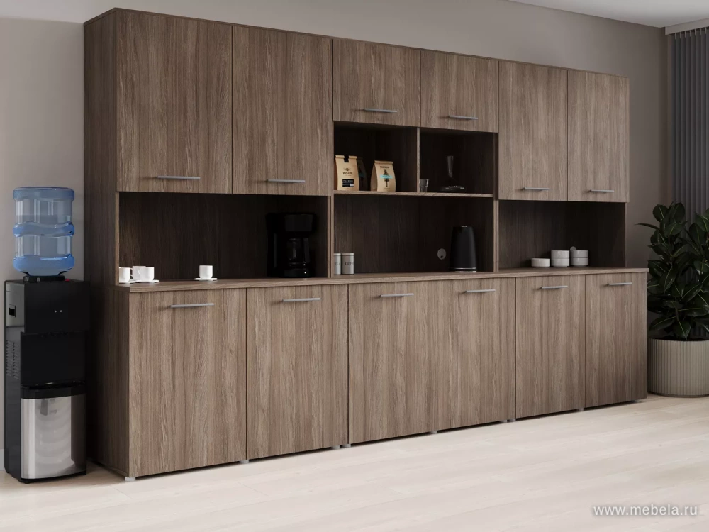 Мини-кухня Фит Аризона гармонично впишется в общий интерьер офиса. Такую мини-кухню можно устанавливать не только в просторных помещения, но и в тех, где важен каждый сантиметр. Особым преимуществом мини-кухни Fit является ее симметричность - в ней легко менять местами полки и ящики.