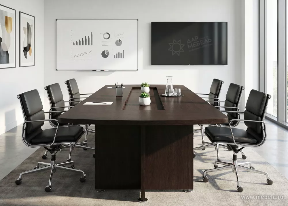 Стол для переговоров Приоритет - солидный стол в сочетании классического и лаконичного урбанистического дизайна. Четкие формы массивной столешницы прямоугольной формы, сплошные опоры из ЛДСП и благородный темный цвет создают в конференц-зале соответствующую деловую и располагающую к официальной беседе атмосферу. ...