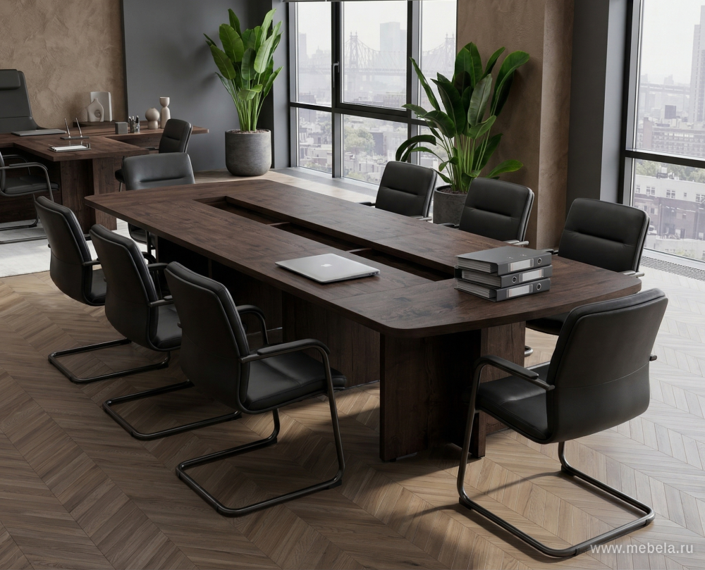 Стол для переговоров Приоритет - солидный стол в сочетании классического и лаконичного урбанистического дизайна. Четкие формы массивной столешницы прямоугольной формы, сплошные опоры из ЛДСП и благородный темный цвет создают в конференц-зале соответствующую деловую и располагающую к официальной беседе атмосферу. ...